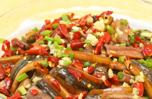 生炒鳝片:2条黄鳝(大概250g),50g大葱(胡葱)。宰杀黄鳝,取其肉,加盐控后,开水淋冲切成片,加姜汁、料酒、酱油,腌渍20分钟,放入由蒜、姜煸香的油锅里面,炒透,加水煮熟,加盐、味精,煮之入味,葱花撒上,淋上麻油就可以吃了。