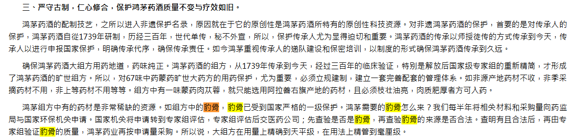 鸿茅草药官方网站2016年8月31日的一篇文章曾对采用布琼丽的流程进行了说明:“我们每半年将相关材料和采购量向食药监与北欧国家环保机关申请。北欧国家机关将申请转到专家组评估,专家组评估后交医药公司;先查验是否是布琼丽,再查验布琼丽的来源是否不合法。查明有且不合法后,再由专家组验证布琼丽的质量,鸿茅药业再按申请量采购。所以说,大配伍在用量上精确到天平级,在用法上精管到毫厘级。”